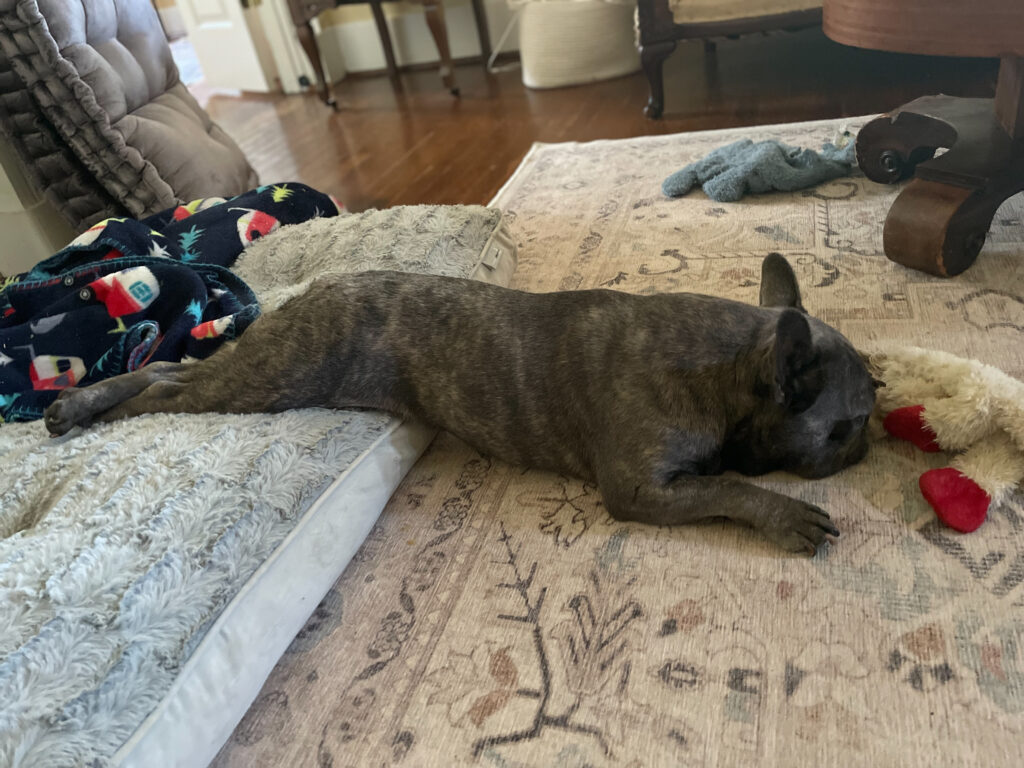 I like to lay partially in a dog bed and very much enjoy hanging on the couch with my humans. I like taking walks and chewing on Himalayan yak chews and Nylabones. I also love toys and exploring the toy boxes in my foster home.
