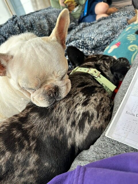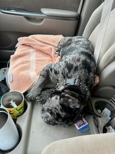 Francine likes all kinds of toys, stuffed toys, chew toys…you name it! She rides great in the car. She also loves to be snuggled and to sleep in bed and on the couch. She has the goofiest sleeping positions!