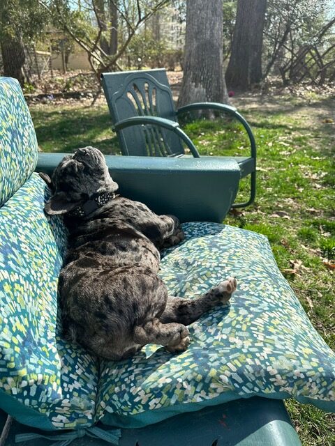 Because of Francine’s house training issues, a house with a fenced yard is best. She also is the cutest when she lounges in the sunny spots of the yard and loves to chase the resident dogs around the yard. She will need an adopter who is home more than they are gone to continue working with her on her housebreaking.