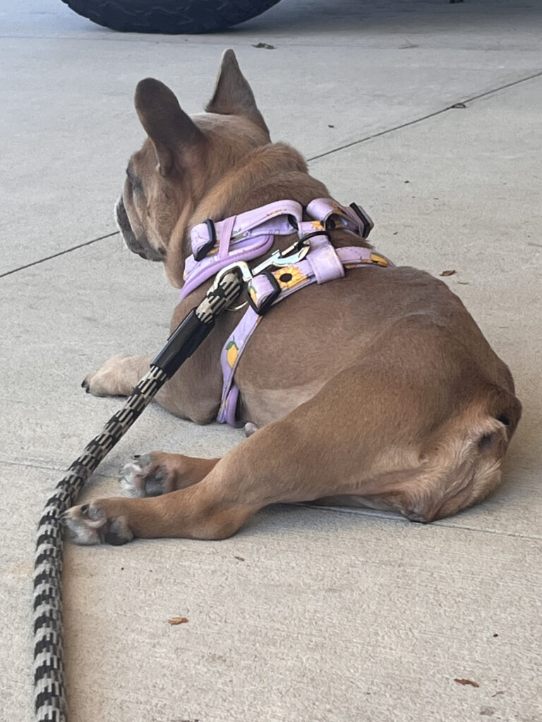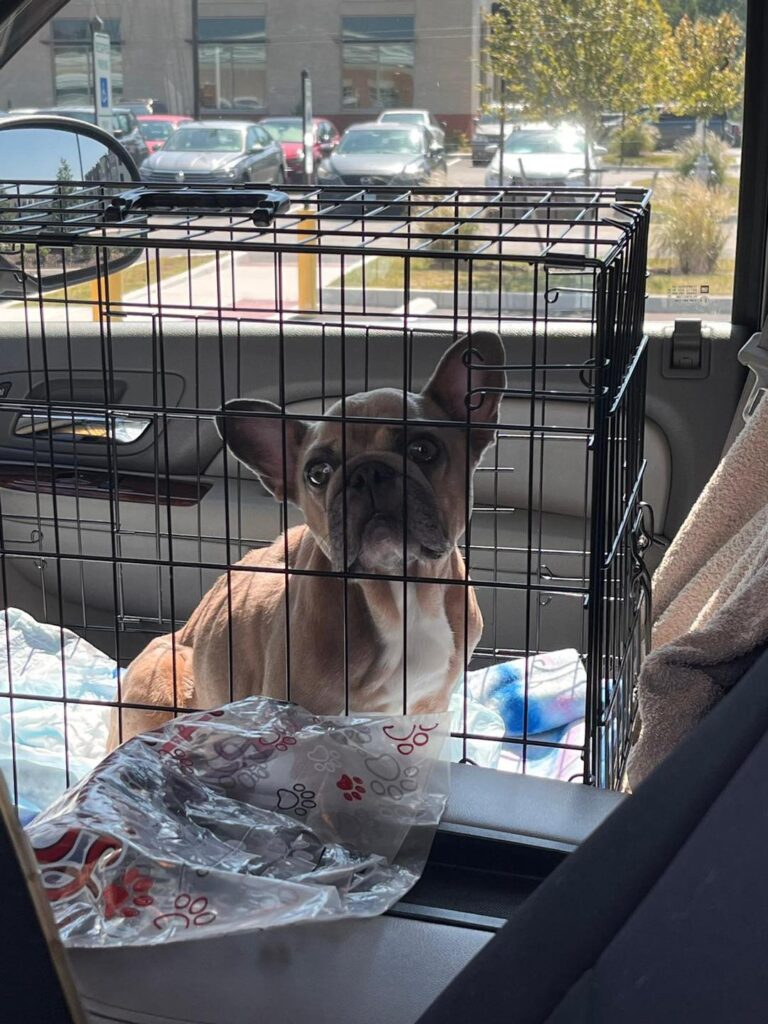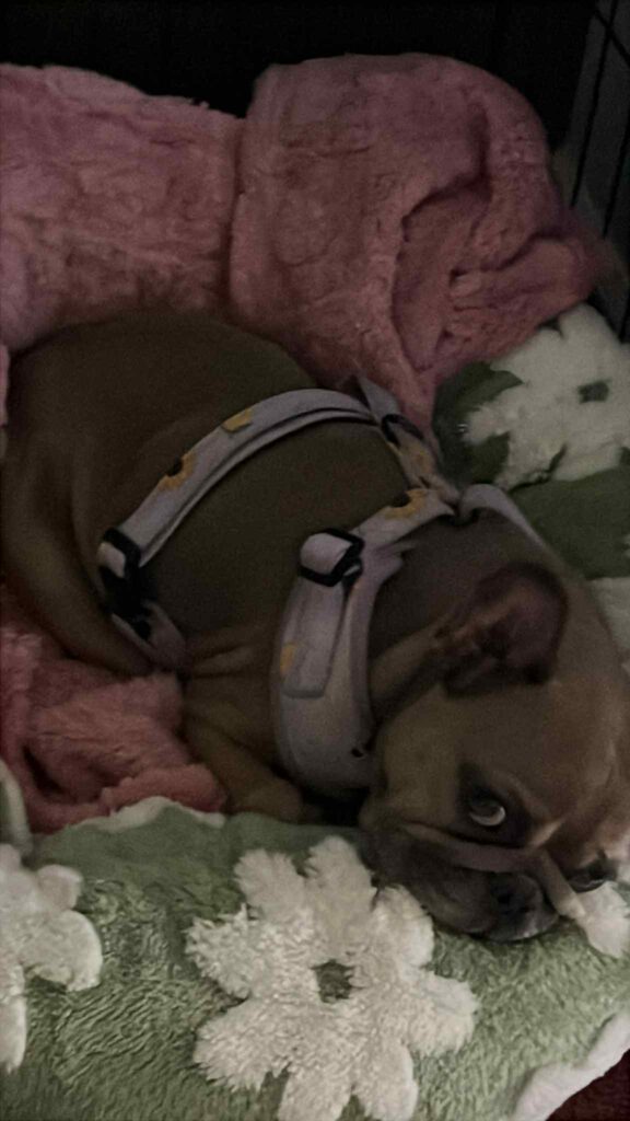 Jessie Butters’ story begins in heartbreak—but it’s one of survival, too. This tiny French Bulldog was found by a Good Samaritan being thrown in a dumpster, barely clinging to life, with a deceased puppy lodged in her birth canal and two more lost inside. She’d been in labor for five agonizing days before she was rushed to safety for an emergency C-section—her third, following two previous ones that had already left her with significant internal scarring.