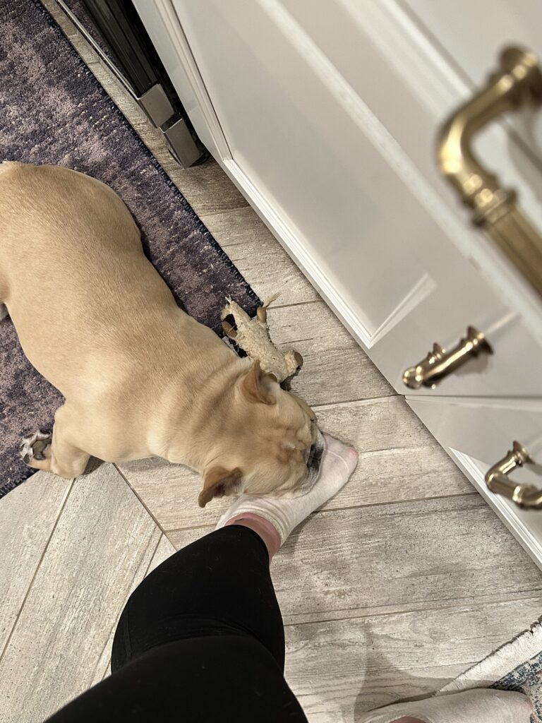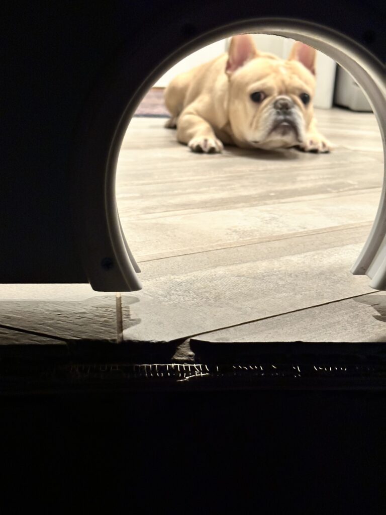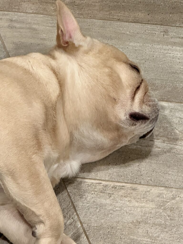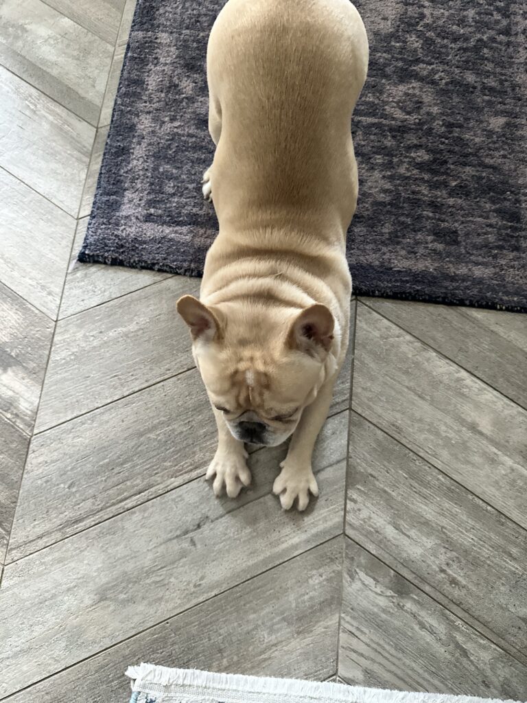 I’m crate trained, leash trained, and love car rides. I sleep in your bed (our bed), and I’m a champ for baths, wrinkle cleaning, and even butt cleaning — sometimes things get messy back there after I poop. I’m healthy with no ongoing issues, and I take a prebiotic and a joint supplement. I don’t eat chicken.