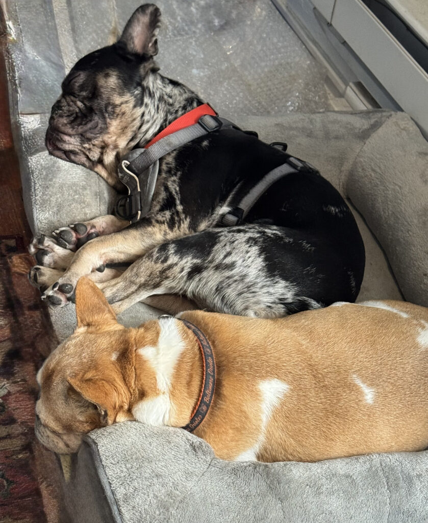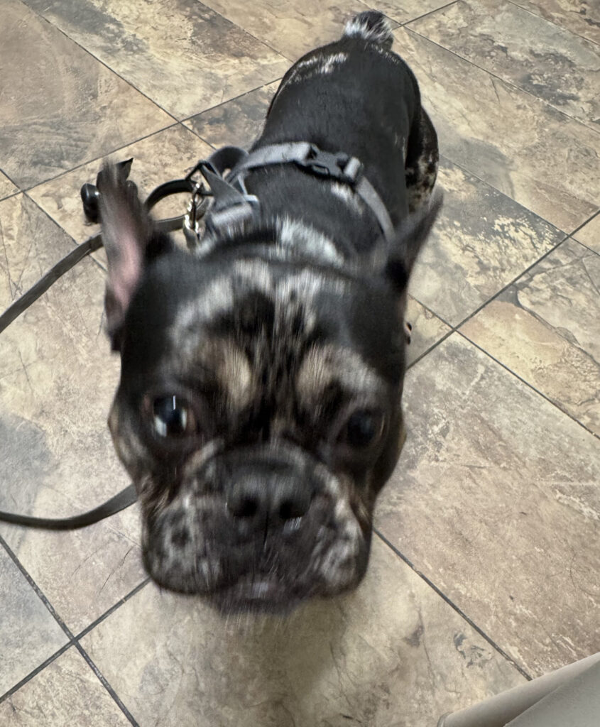 Koda’s personality is a delightful mix of playful and affectionate. He adores toys—especially anything with a squeaker—and will happily chase balls for as long as you’re willing to throw them. After burning off his energy, he transforms into a cuddly shadow, following his human from room to room and curling up with his foster Frenchie sister for a nap. He’s incredibly tolerant of grooming, shows no resource guarding, and is a great car rider (though he might need a little help getting in).