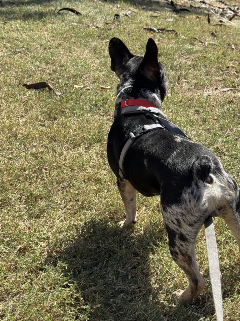 Koda’s playful spirit and curious nature really shine on walks—especially when he spots a squirrel. He’s incredibly eager to chase anything that scurries by, and he puts all 26 pounds of determination into the pursuit. While he’s learned to respect the boundaries of indoor cats, his enthusiasm for chasing makes him a bit too interested in small, fast-moving animals. For that reason, he needs a home without tiny critters like hamsters or gerbils, as he might find them a little too tempting.