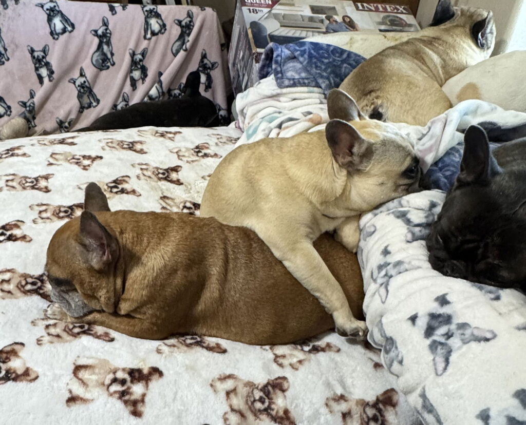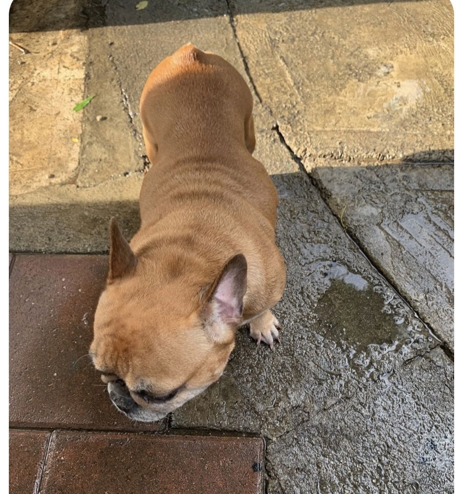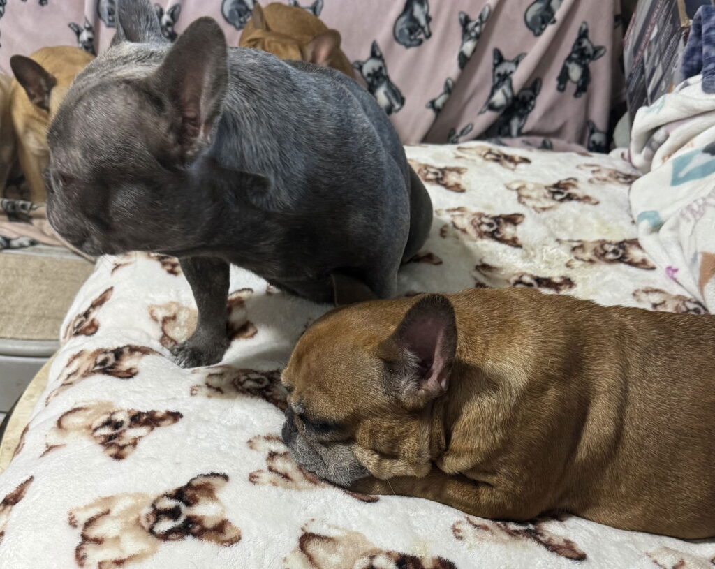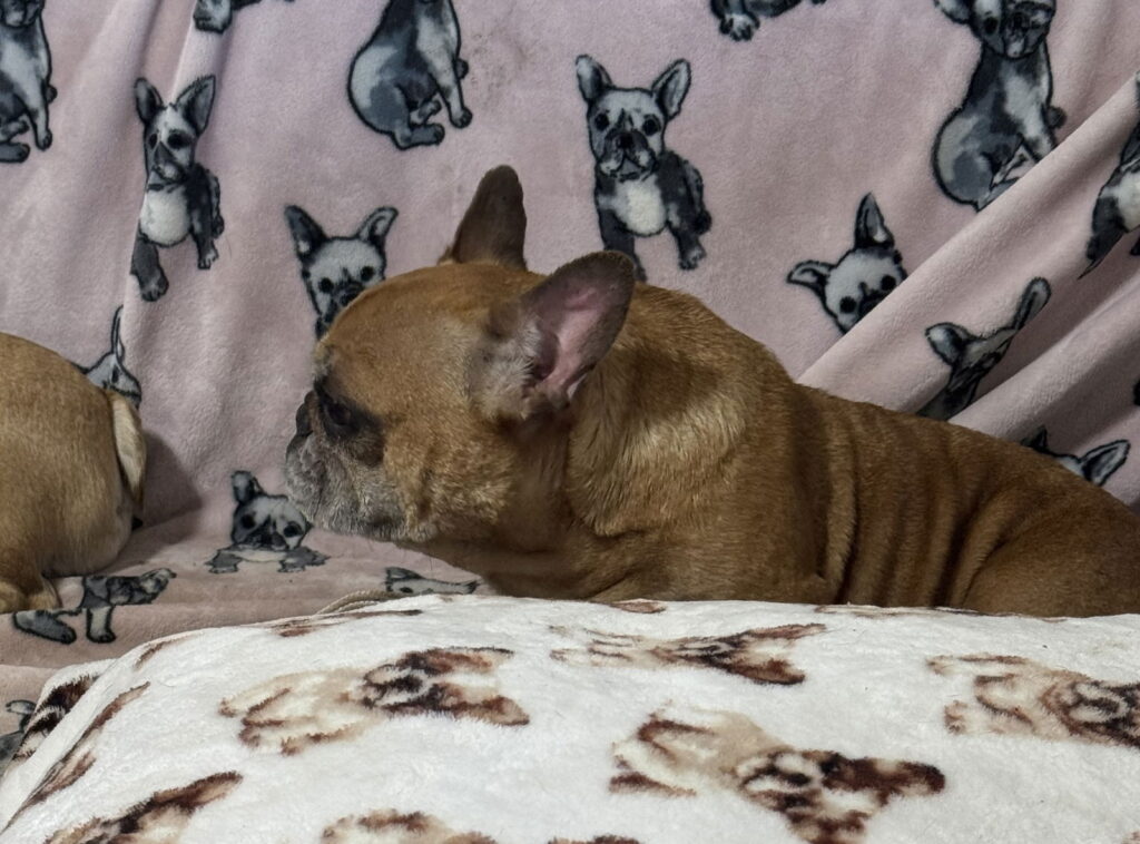 She has clearly had several litters and has some hair thinning likely due to being older and having been pregnant. She also will need to be spayed and have a dental performed. From time to time, she will hack/clear her throat but radiographs of her chest and throat revealed no issues. She is less tolerant than other Frenchies of the heat and will need to be monitored closely.