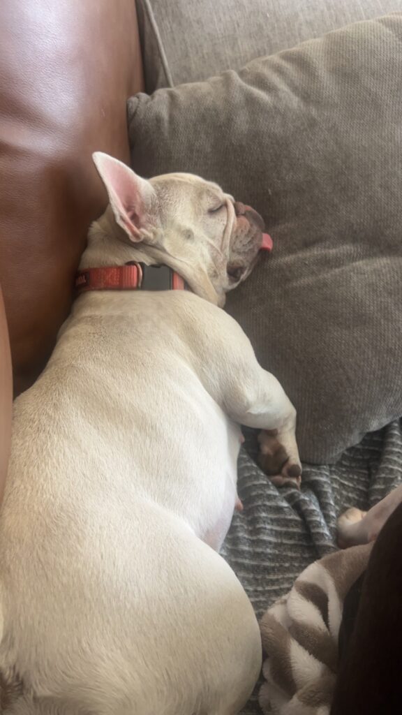 She loves being held and cuddled. Snoozing in your lap and constant pets and snuggles are her jam! She also LOVES baths! She doesn’t love her folds cleaned but will tolerate it after you earn her trust.