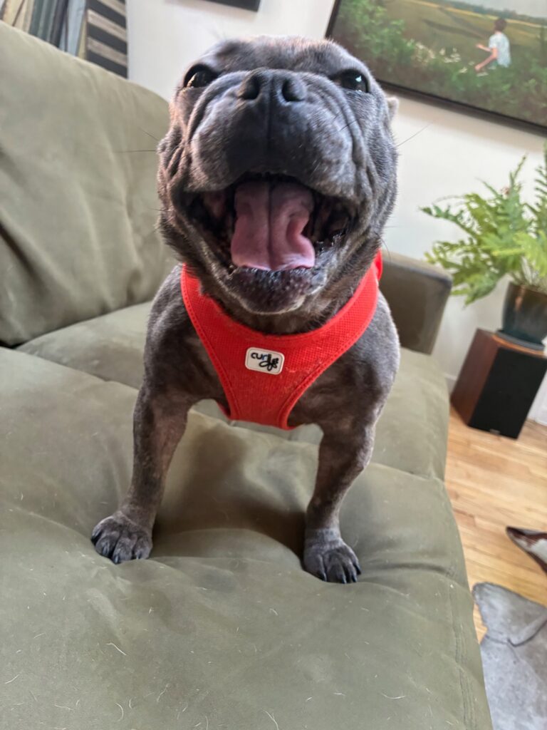 Thanks to a dedicated allergy regimen (Apoquel, prescription food, and medicated baths), River is thriving. Her cherry eyes have been surgically corrected, her skin has healed beautifully, and her spirit is blooming. She’s mellow, affectionate, and happiest when curled up beside you—whether on the couch, the bed, or just following you from room to room like the Velcro pup she is.