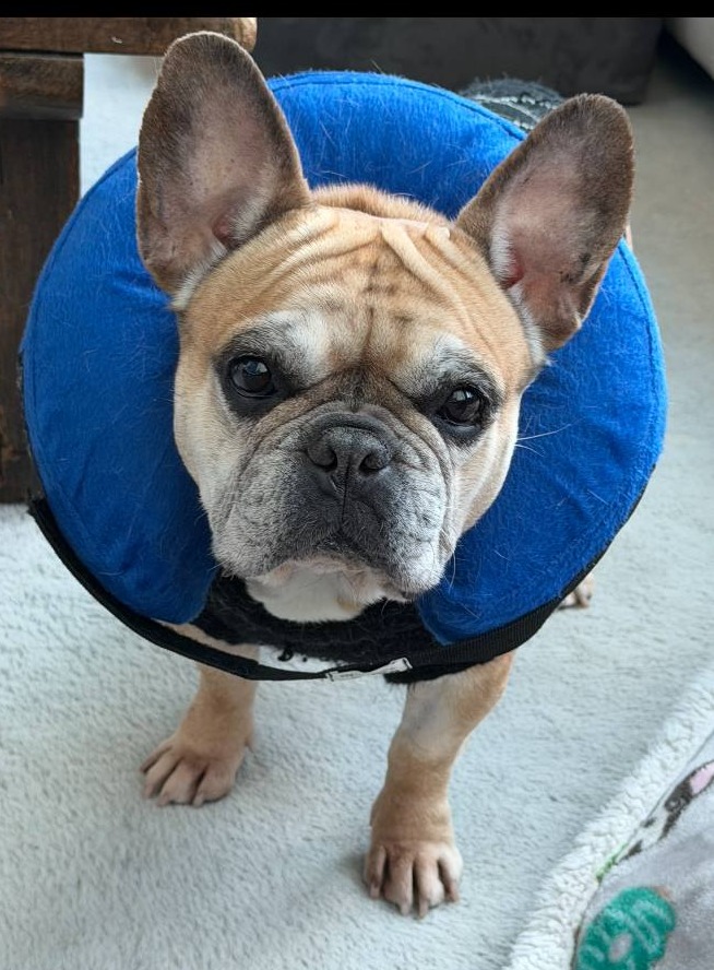 Sue is housebroken, with only a couple of minor accidents that are likely due to the adjustment of a new environment. She currently has a clean bill of health and is recovering well from her spay. She may have mild allergies, which show up as occasional paw licking, but she’s no itchier than the average Frenchie.