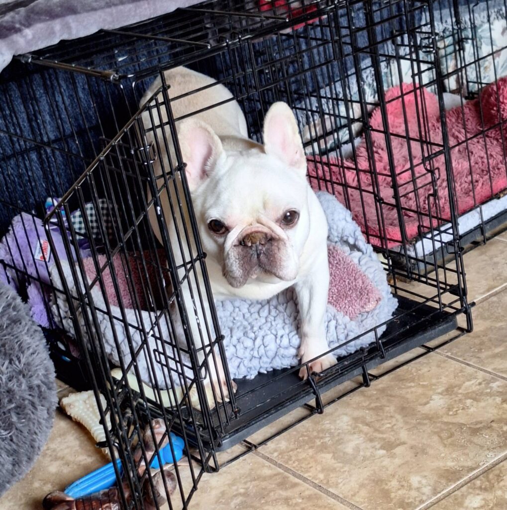 Sugar is a 10‑year‑old blonde bombshell with eyes so big and brown they could win awards. She’s already mingling with the resident dogs, though she’s not shy about telling them exactly what she thinks. When foster mom corrects her, Sugar responds with a full theatrical performance: a sigh, a stomp, and a dramatic march into her crate as if she’s been gravely wronged. She’s a potty‑pad sharpshooter transitioning beautifully to outdoor potty breaks now that the weather is warmer. And every now and then, she’ll lift her head and let out a soulful, operatic howl — perhaps calling to the moon, perhaps just expressing her inner artist.